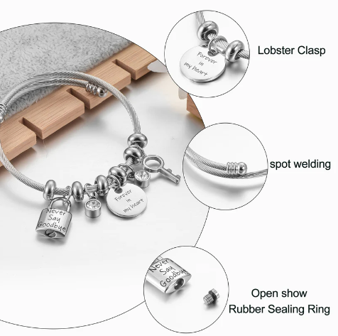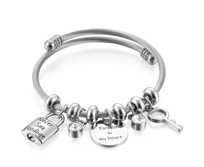 Model No.: HRM-CB-7 Material: Stainless Steel Diameter: 60mm Color: Silver Inscription: Never Say Goodbye+Forever in my heart Weight: 31.7g